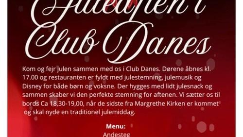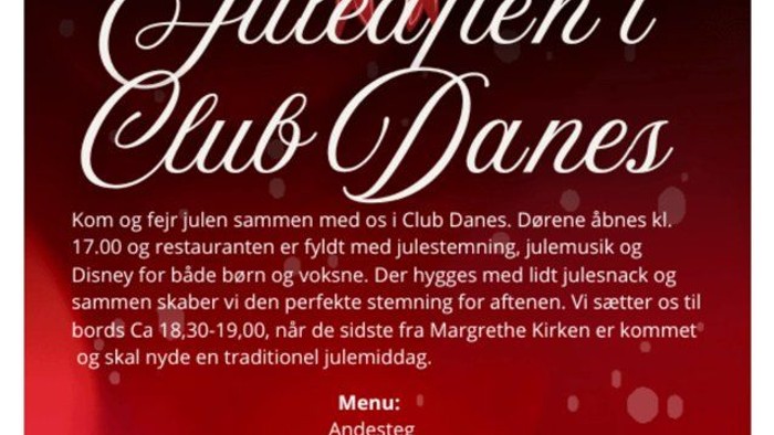 Julemiddag: I år serveres julemiddagen IKKE i kirken, MEN i Club Danés. Tilmelding og betaling kan ske i kirken i forbindelse med gudstjenester eller via klubbens hjemmeside www.clubdanes.dk. Sidste tilmelding 18.12.2025. Dørene åbnes kl. 17 og ca. kl. 18.30/19.00 serveres der traditionel julemiddag. Der sluttes af med hygge, julesang, dans m.v. Pris pr. person 49,50 – børn halv pris.